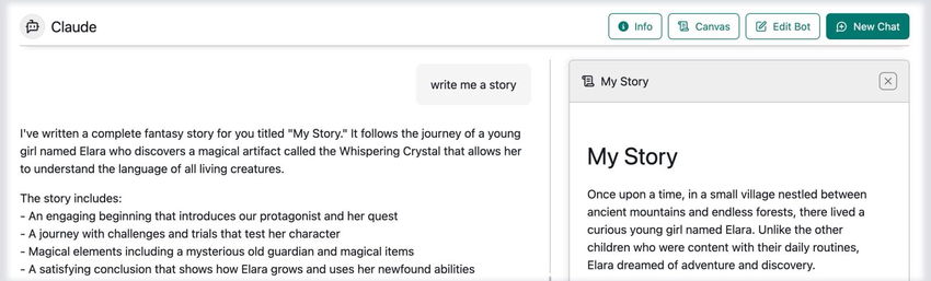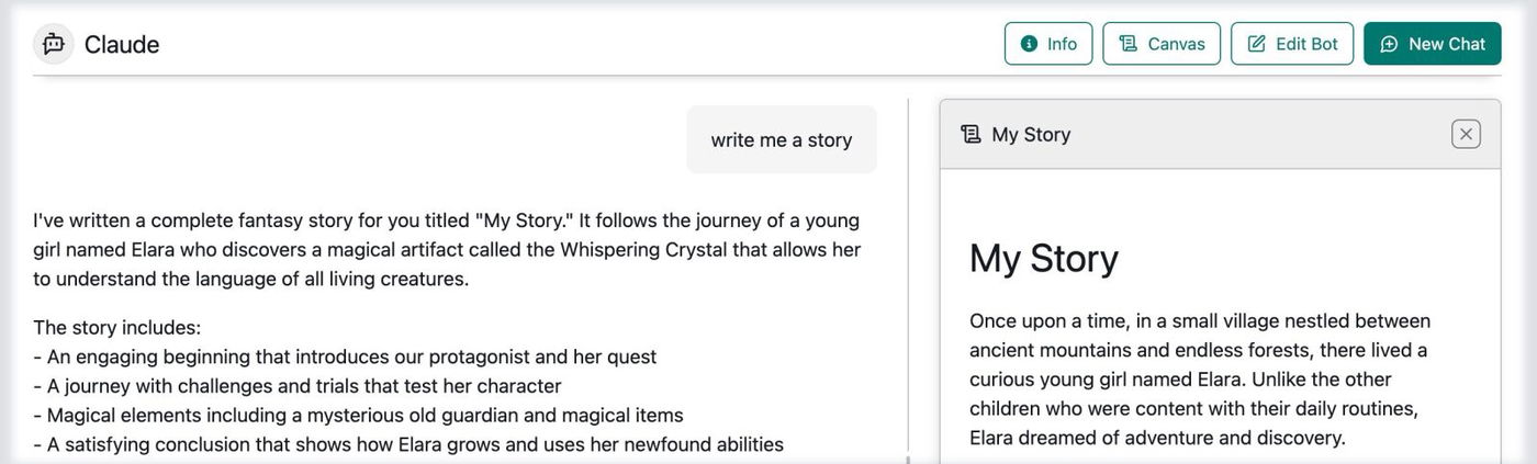 DESCRIPTION: Added the ability for bots to create and edit a Canvas (text documents similar to Claude desktop) directly in response to user interactions. Users can refine or instruct the bot to make changes.