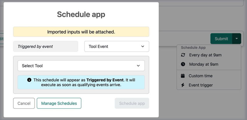 DESCRIPTION: Introduced event-based triggers for app workflows, allowing apps to run based on events from integrated tools. Built upon the existing Schedules UX for enhanced scheduling flexibility.